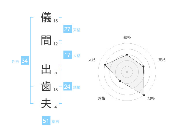 儀間 出歯夫さんの総格は51画の3点!