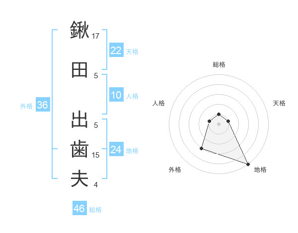 鍬田 出歯夫さんの総格は46画の1点!