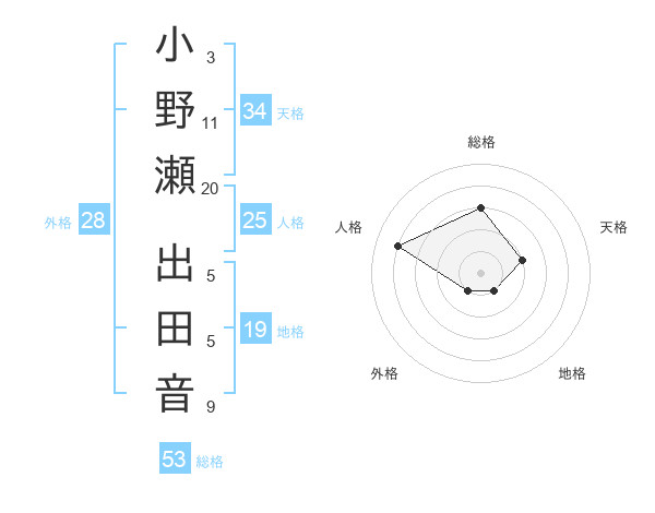 小野瀬 出田音さんを姓名の画数から五運を鑑定