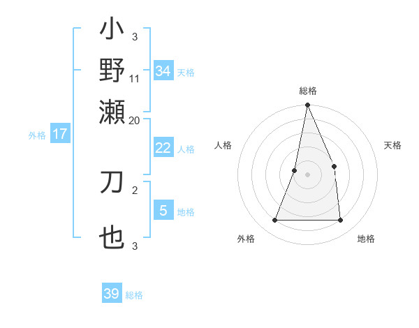 小野瀬 刀也さんの総格は39画の5点!