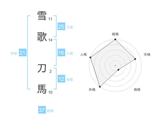 雪歌 刀馬さんを姓名の画数から五運を鑑定