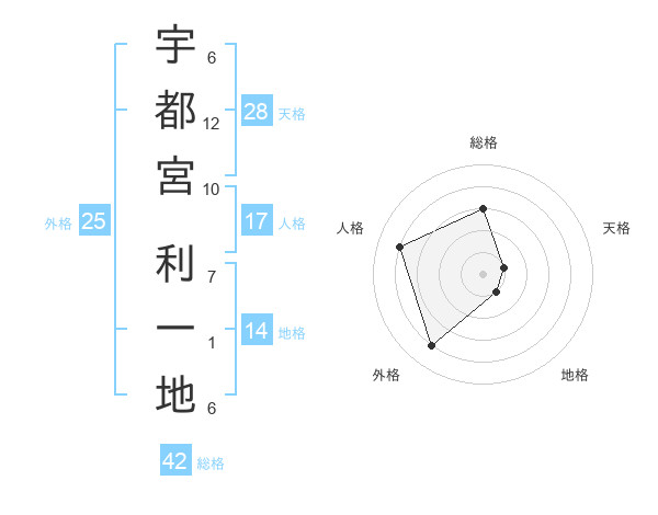宇都宮 利一地さんの総格は42画の3点!