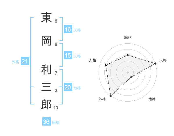 東岡 利三郎さんの天格は16画の5点!