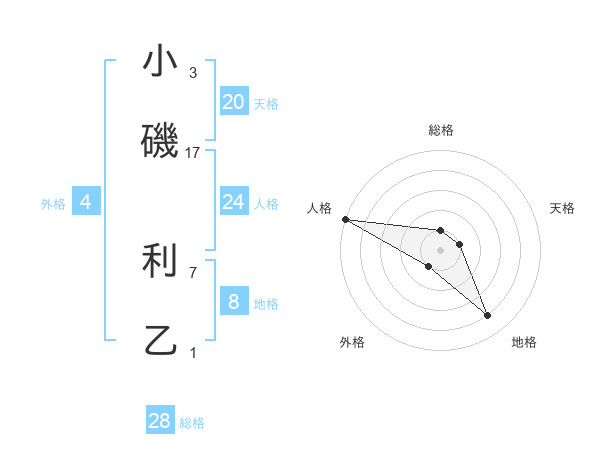 小磯 利乙さんを姓名の画数から五運を鑑定