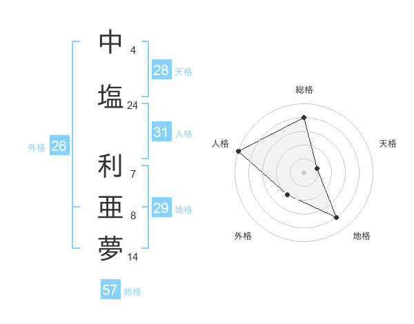 中塩 利亜夢さんの総格は57画の4点!