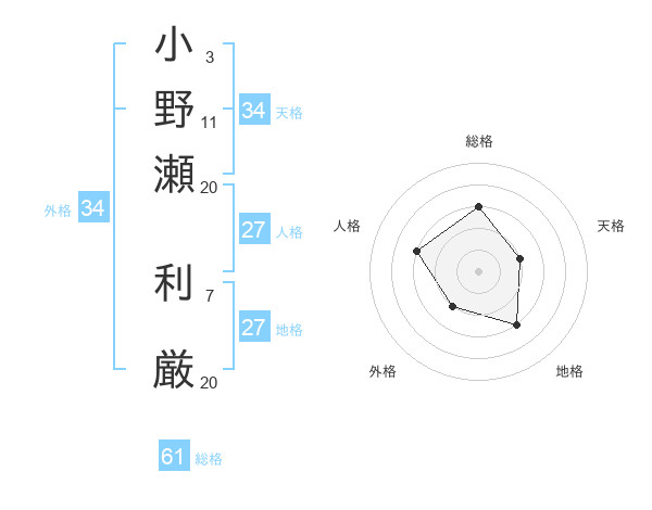 小野瀬 利厳さんの総格は61画の3点