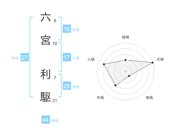 六宮 利駆さんの天格は16画の5点!