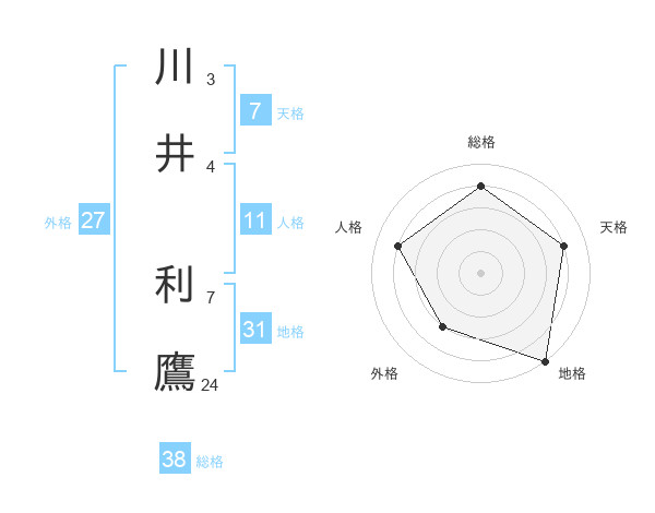 川井 利鷹さんの総格は38画の4点!