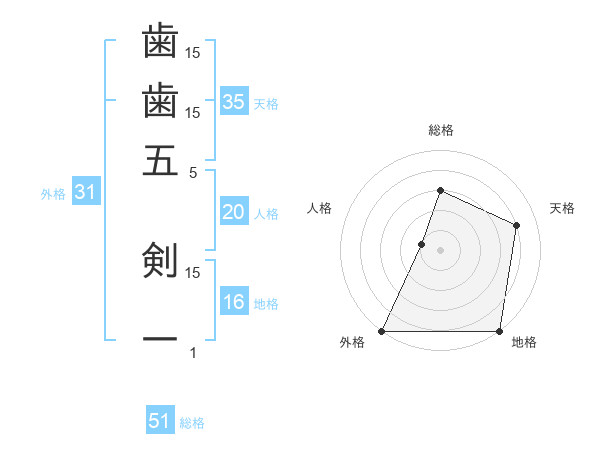 歯歯五 剣一さんを姓名の画数から五運を鑑定