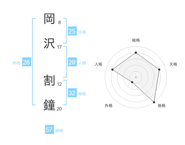 岡沢 割鐘さんの総格は57画の4点!