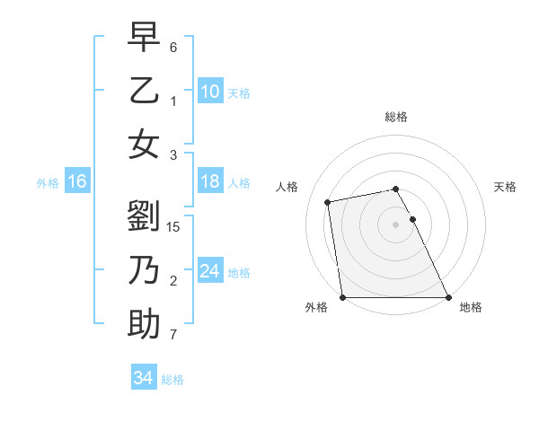 早乙女 劉乃助さんの総格は34画の2点!