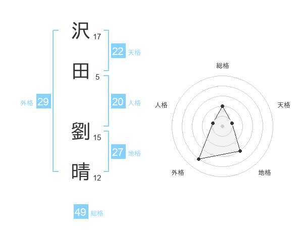 沢田 劉晴さんの天格は22画の1点!