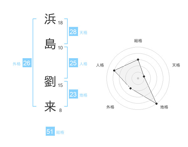 浜島 劉来さんを姓名の画数から五運を鑑定