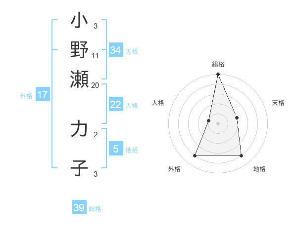 小野瀬 力子さんの総格は39画の5点!