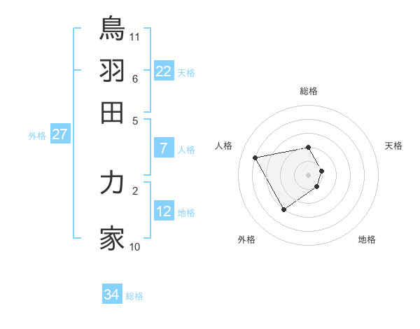 鳥羽田 力家さんの総格は34画の2点!