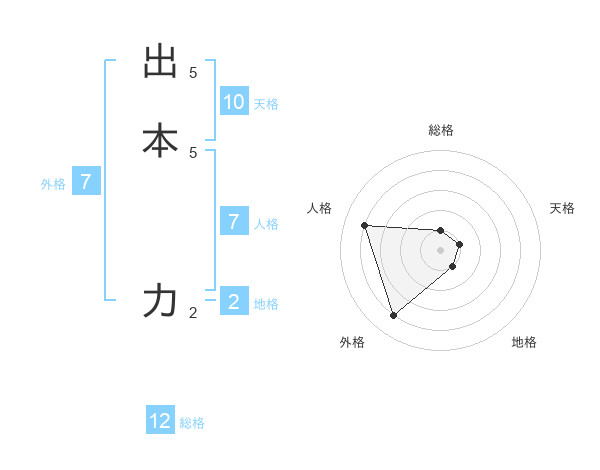 出本 力さんの総格は12画の1点