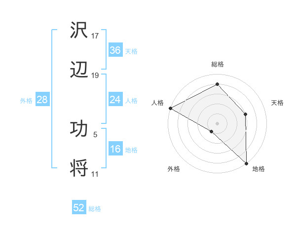沢辺 功将さんの総格は52画の4点!