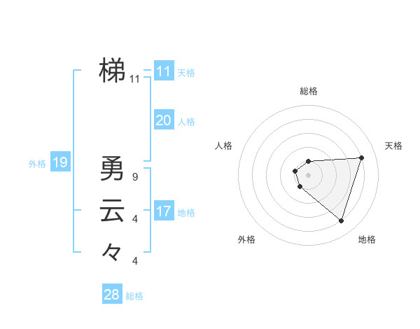 梯 勇云々さんの総格は28画の1点!