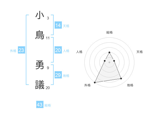 小鳥 勇議さんの総格は43画の2点!