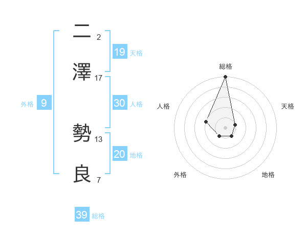 二澤 勢良さんの総格は39画の5点!