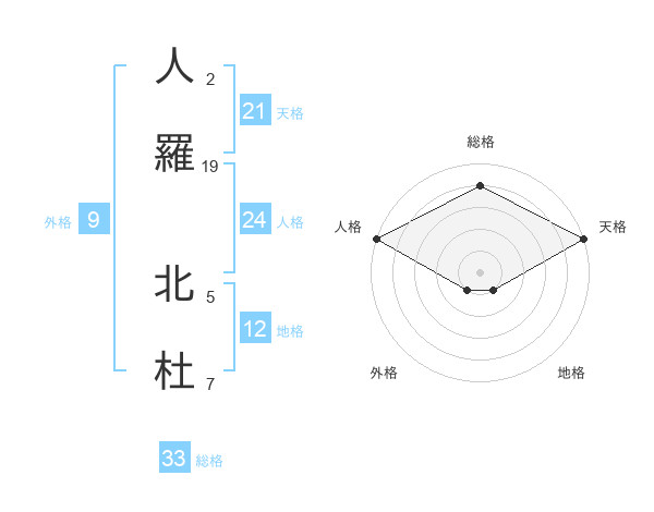 人羅 北杜さんを姓名の画数から五運を鑑定