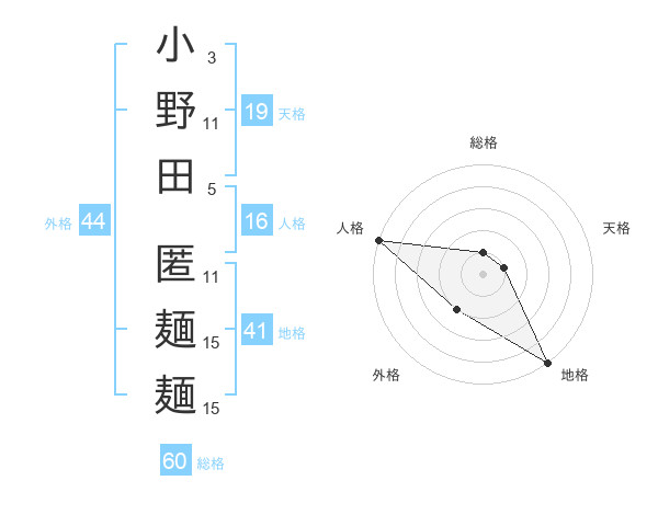 小野田 匿麺麺さんの総格は60画の1点!