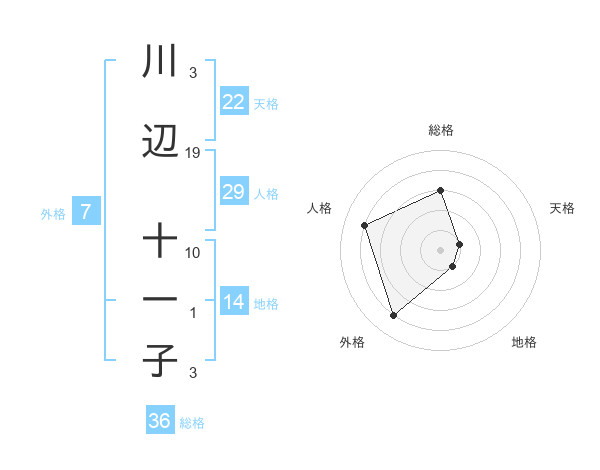 川辺 十一子さんの天格は22画の1点