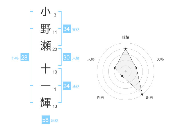 小野瀬 十一輝さんの総格は58画の4点!