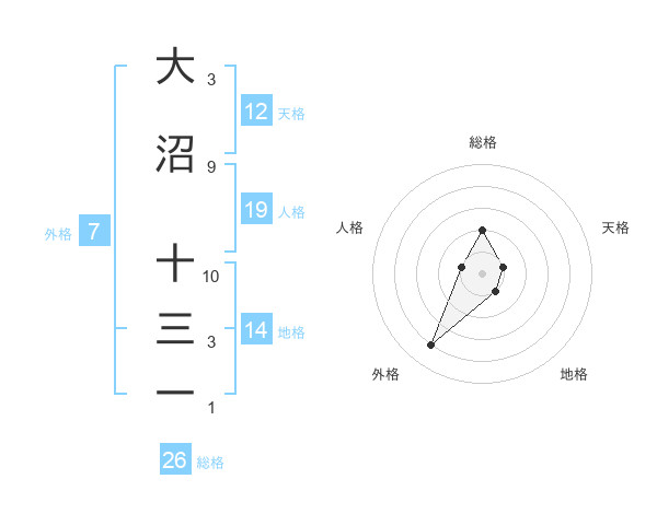 大沼 十三一さんの総格は26画の2点!
