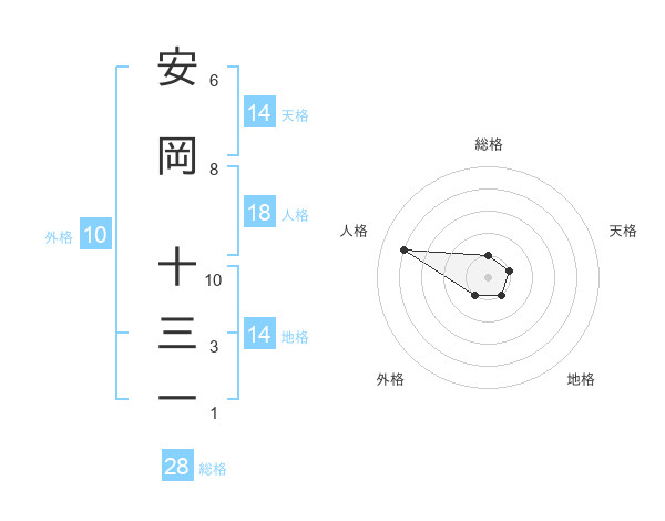 安岡 十三一さんを姓名の画数から五運を鑑定