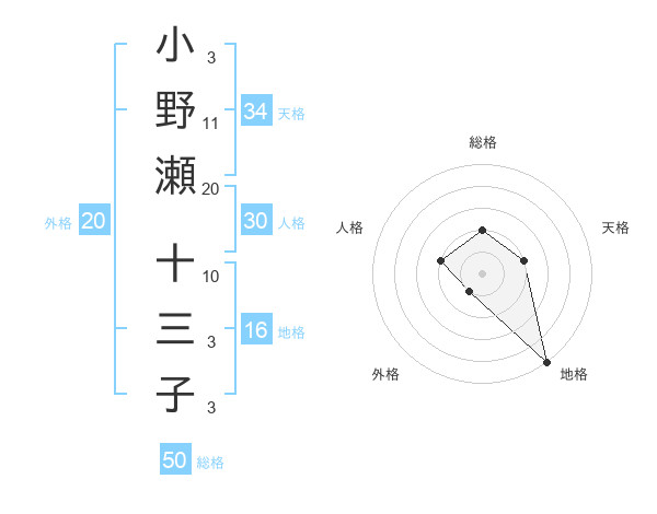 小野瀬 十三子さんを姓名の画数から五運を鑑定