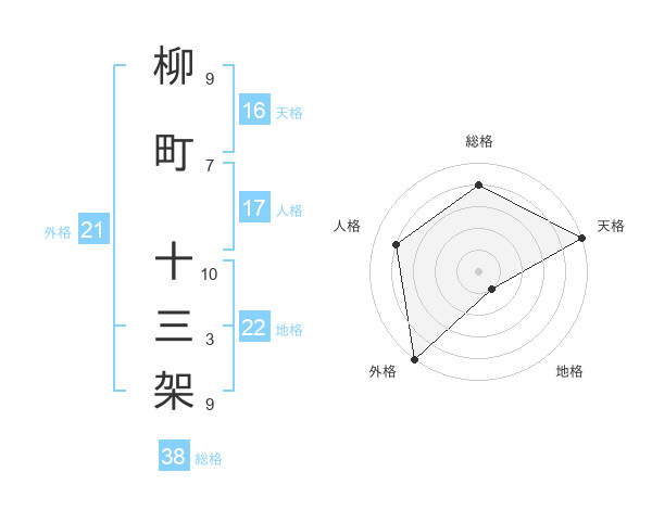 柳町 十三架さんを姓名の画数から五運を鑑定