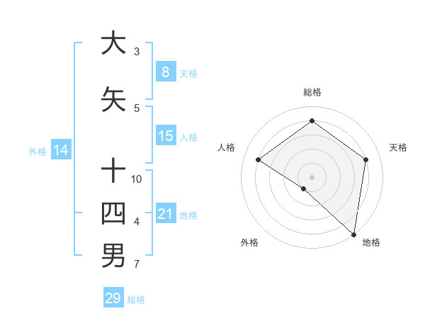 大矢 十四男さんを姓名の画数から五運を鑑定