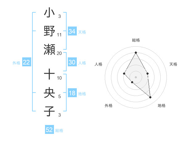 小野瀬 十央子さんを姓名の画数から五運を鑑定