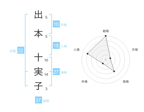 出本 十実子さんの総格は37画の5点!