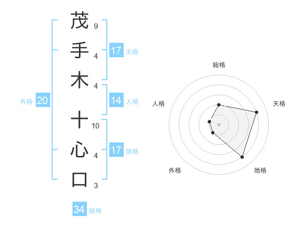 茂手木 十心口さんの総格は34画の2点!