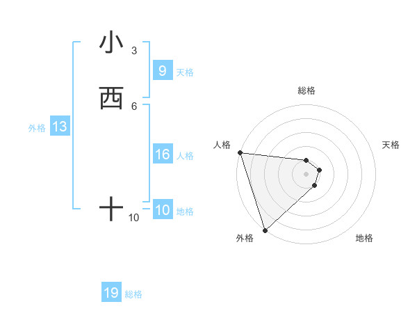 小西 十さんの外格は13画の5点!