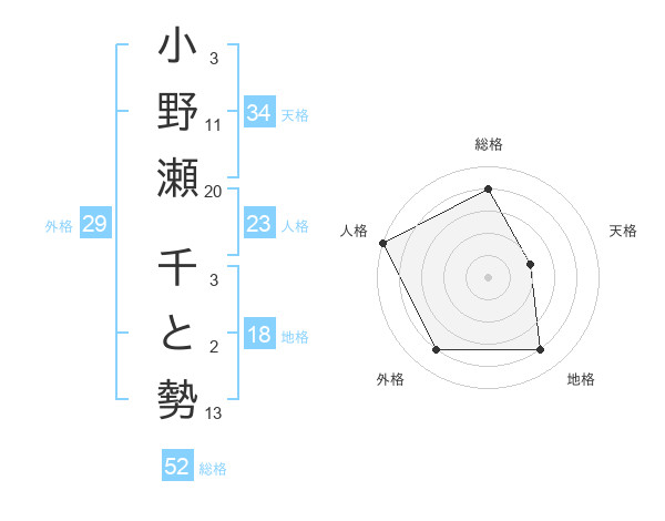 小野瀬 千と勢さんの総格は52画の4点!