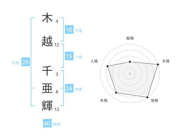 木越 千亜輝さんの天格は16画の5点!