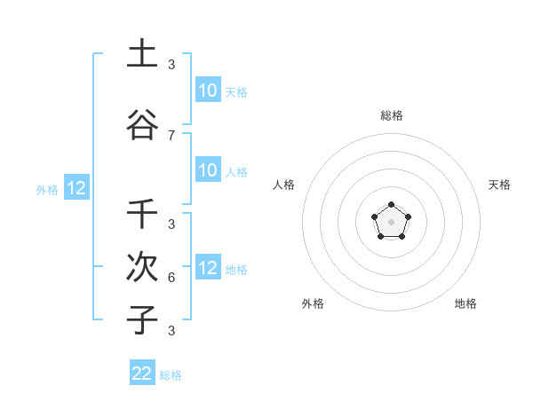 土谷 千次子さんの総格は22画の1点!