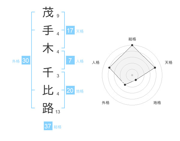 茂手木 千比路さんの総格は37画の5点!