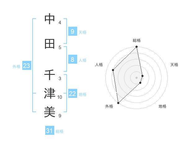 中田 千津美さんの総格は31画の5点