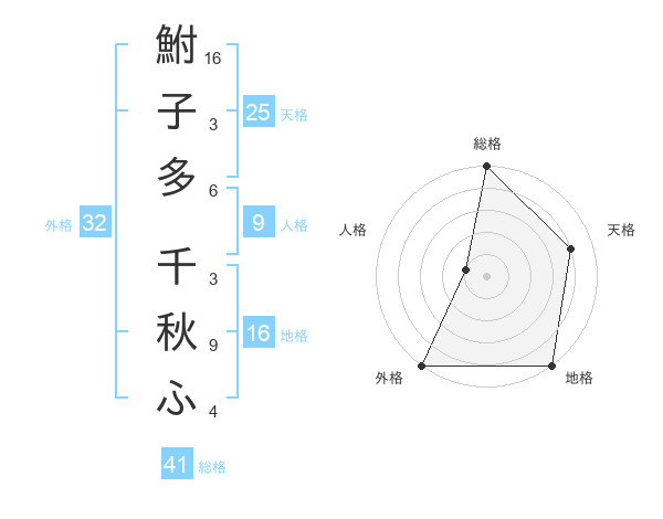 鮒子多 千秋ふさんの総格は41画の5点!