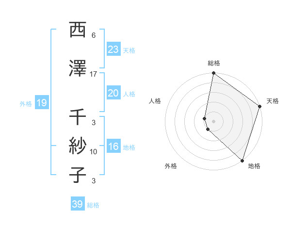西澤 千紗子さんを姓名の画数から五運を鑑定