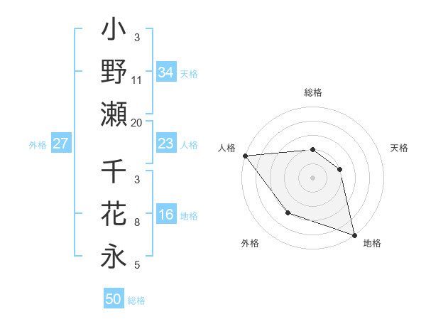 小野瀬 千花永さんを姓名の画数から五運を鑑定