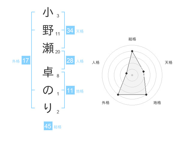 小野瀬 卓のりさんを姓名の画数から五運を鑑定