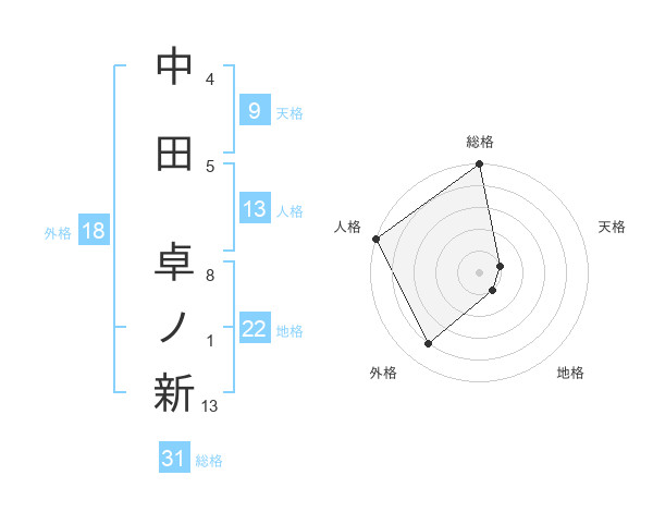 中田 卓ノ新さんを姓名の画数から五運を鑑定