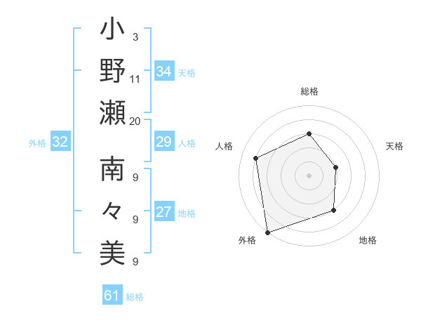 小野瀬 南々美さんの総格は61画の3点!