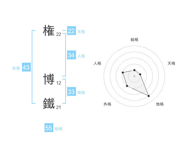 権 博鐵さんの総格は55画の1点!
