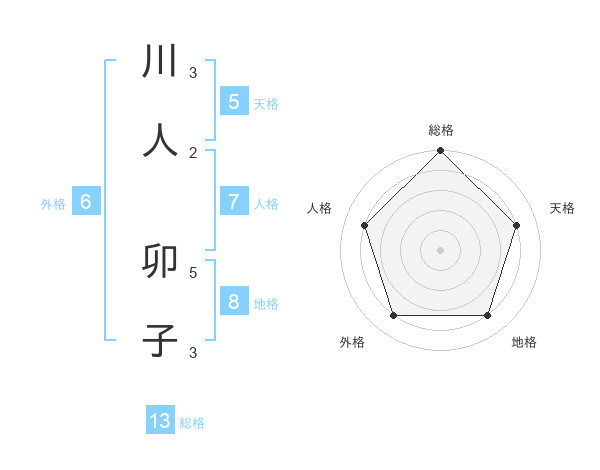 川人 卯子さんの総格は13画の5点!
